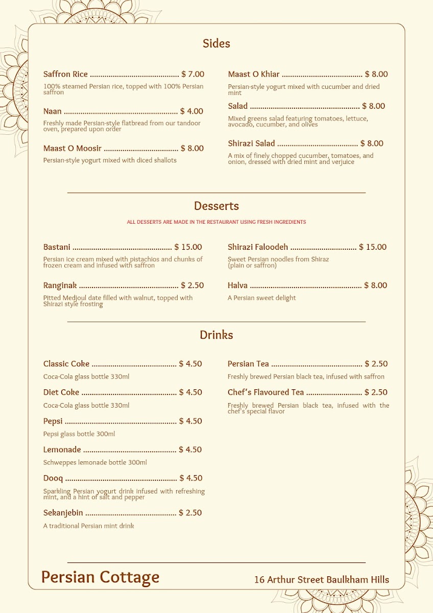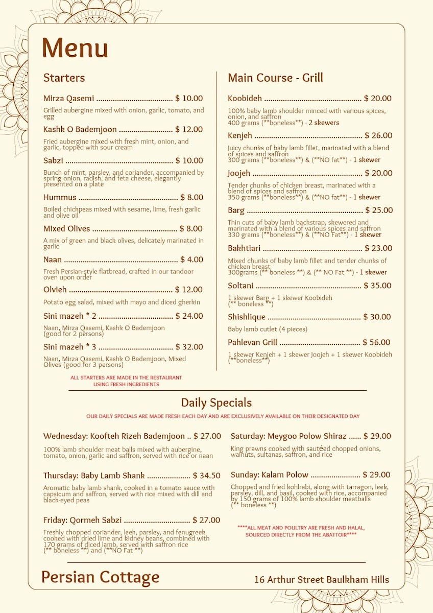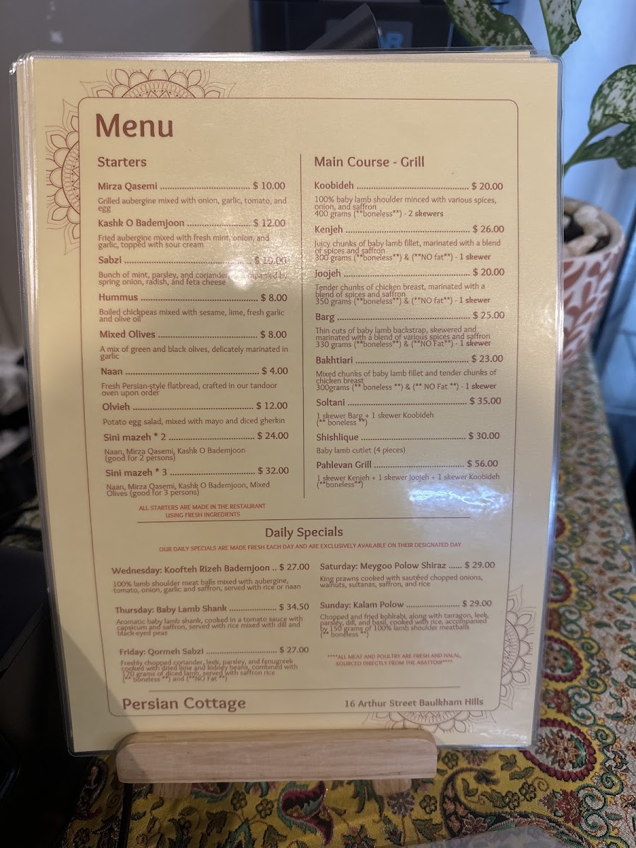 The menu at Persian Cottage offers a delightful variety of Persian dishes, each with unique flavors and textures. For daily specials, you can enjoy Koofteh Rizeh Bademjoon on Wednesdays, Baby Lamb Shank on Thursdays, Qormeh Sabzi on Fridays, Meygoo Polow Shiraz on Saturdays, and Kalam Polow on Sundays. The grill section features hearty options like Koobideh, Kenjeh, JoojehBarg, and Bakhtiari, all cooked to perfection. For starters, the restaurant offers rich and savory choices, including Mirza Qasemi, Kashk O Bademjoon, Mixed Olives Naan, and Olivieh. The side dishes are also not to be missed, with Saffron Rice, Mast O Khiar, Mast O Moosir, and the refreshing Shiraz Salad. To end your meal on a sweet note, indulge in traditional Persian desserts like Ranginak, Shole Zard, Bastani Shirazi, and Faloodeh. Whether you're in the mood for a light appetizer or a filling main course, Persian Cottage offers something to suit every palate.